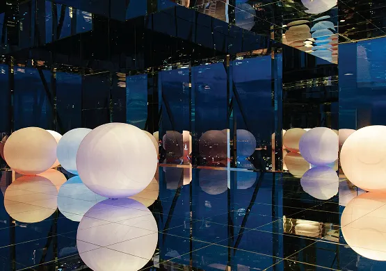 Mirrored room where glowing lanterns surround you, turning the space into a living night of light and meaning.