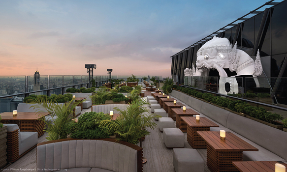 Sunset-to-late rooftop cultural shows, bottle parades, live DJ, skyline cocktails.