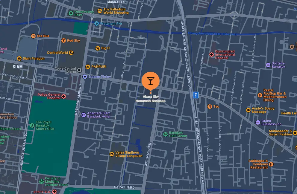 Order at Baan Hanuman (L58); items purchased there may be enjoyed on this level (daytime). From 4:30 pm, normal table service is available at Hanuman Sky Bar & Restaurant (L61).